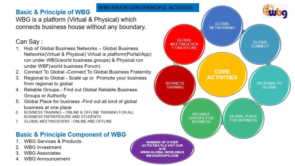 World Business Groups is the global platform to create a place and connect to the world’s business houses and business professions to enable them to share the business opportunities and expertise with convenient to more productive and become a successful to acquire the apex position in the same domain.